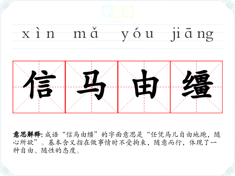 成语“信马由缰”的字面意思是“任凭马儿自由地跑,随心所欲”。基本含义指在做事情时不受拘束,随意而行,体现了一种自由、随性的态度。
