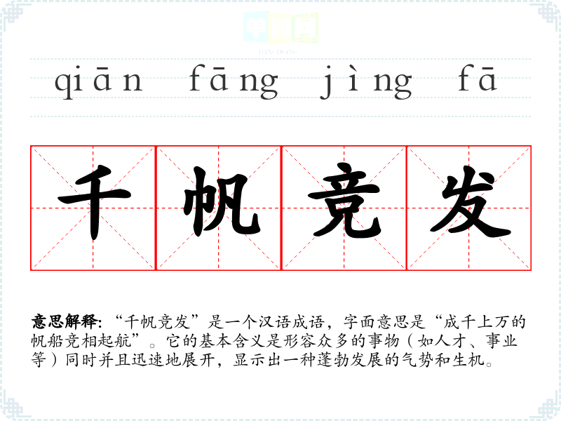 “千帆竞发”是一个汉语成语,字面意思是“成千上万的帆船竞相起航”。它的基本含义是形容众多的事物(如人才、事业等)同时并且迅速地展开,显示出一种蓬勃发展的气势和生机。