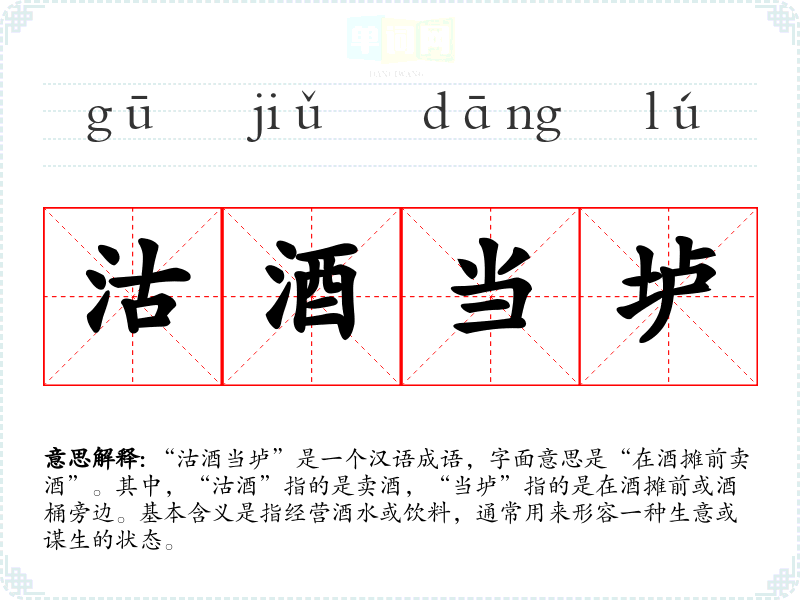 | 沽酒当垆 | 沽:卖;当垆:古代酒店垒土成垆,用以安放酒瓮,卖酒的人守在垆边,叫做当垆。原指古代卖酒的人。后引申为名士隐身于尘世间。 |
