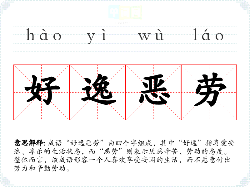 成语“好逸恶劳”由四个字组成,其中“好逸”指喜爱安逸、享乐的生活状态,而“恶劳”则表示厌恶辛苦、劳动的态度。整体而言,该成语形容一个人喜欢享受安闲的生活,而不愿意付出努力和辛勤劳动。