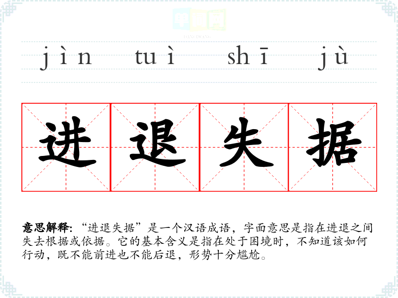 “进退失据”是一个汉语成语,字面意思是指在进退之间失去根据或依据。它的基本含义是指在处于困境时,不知道该如何行动,既不能前进也不能后退,形势十分尴尬。