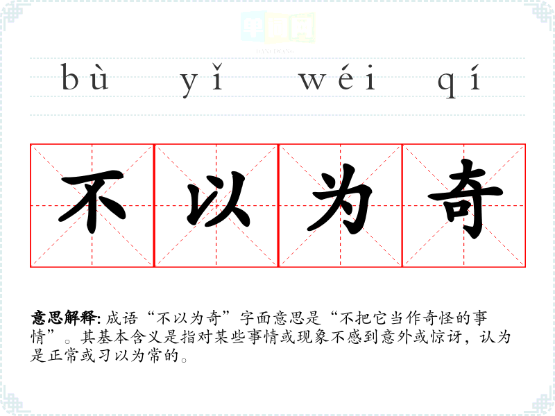 成语“不以为奇”字面意思是“不把它当作奇怪的事情”。其基本含义是指对某些事情或现象不感到意外或惊讶,认为是正常或*以为常的。