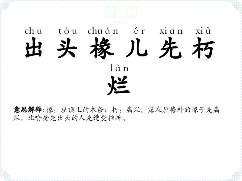 | 出头椽儿先朽烂 | 椽:屋顶上的木条;朽:腐烂。露在屋檐外的椽子先腐烂。比喻抢先出头的人先遭受挫折。 |