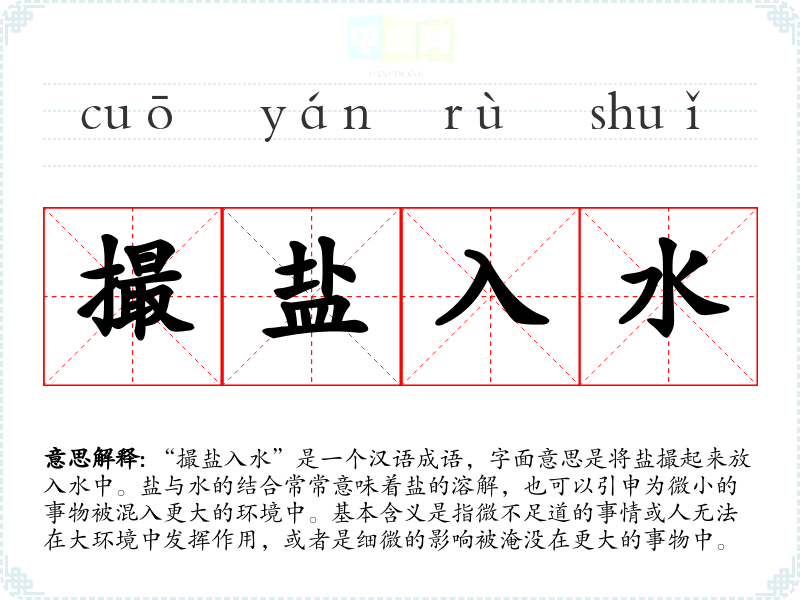 “撮盐入水”是一个汉语成语,字面意思是将盐撮起来放入水中。盐与水的结合常常意味着盐的溶解,也可以引申为微小的事物被混入更大的环境中。基本含义是指微不足道的事情或人无法在大环境中发挥作用,或者是细微的影响被淹没在更大的事物中。