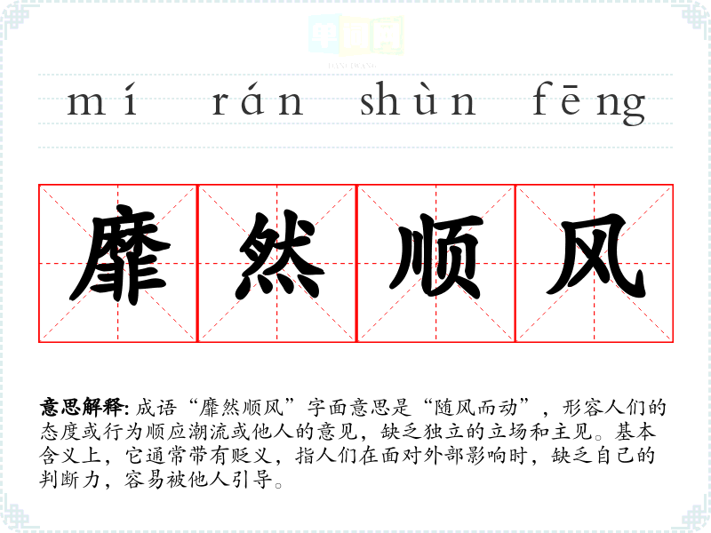 成语“靡然顺风”字面意思是“随风而动”,形容人们的态度或行为顺应潮流或他人的意见,缺乏独立的立场和主见。基本含义上,它通常带有贬义,指人们在面对外部影响时,缺乏自己的判断力,容易被他人引导。