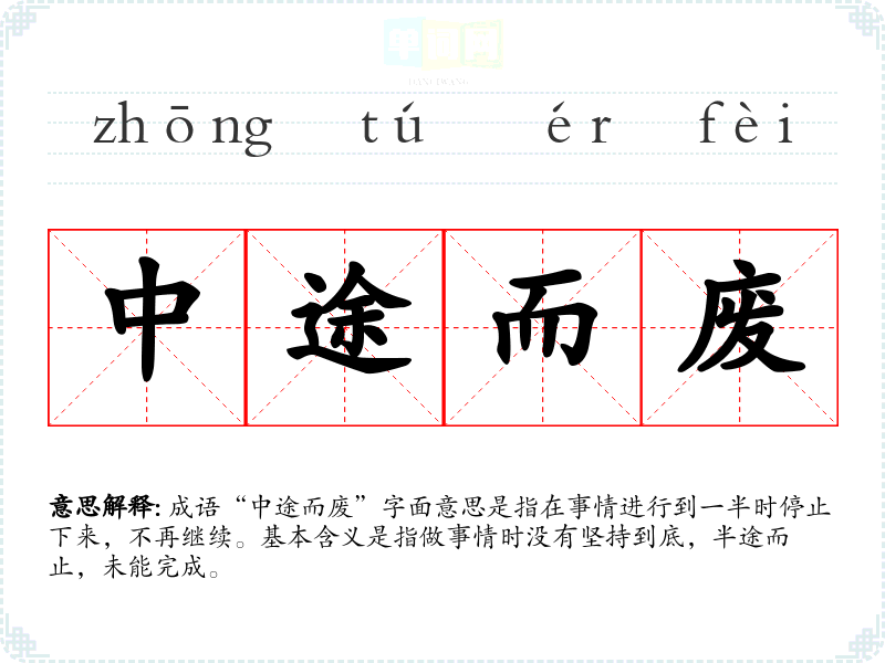 成语“中途而废”字面意思是指在事情进行到一半时停止下来,不再继续。基本含义是指做事情时没有坚持到底,半途而止,未能完成。