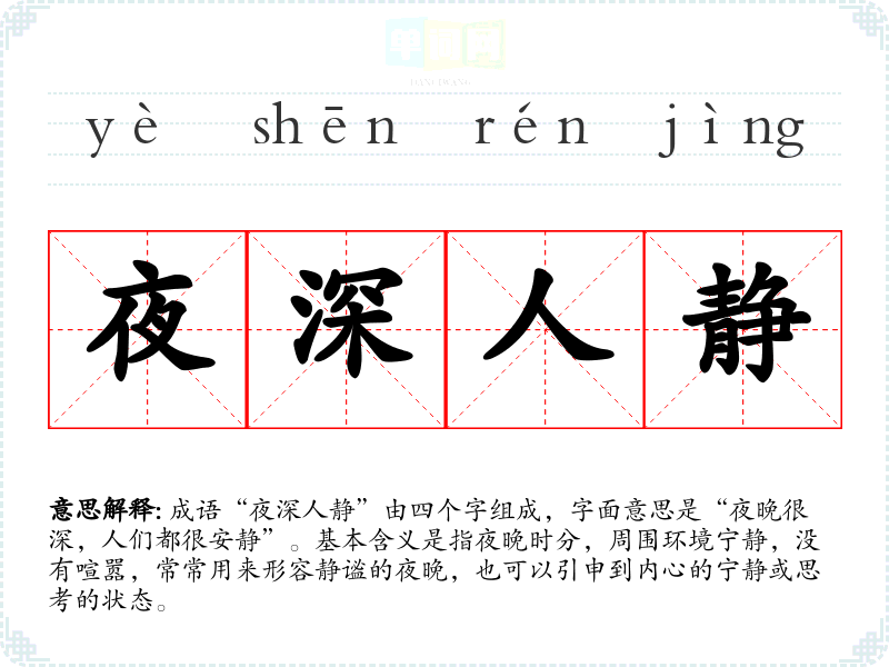 成语“夜深人静”由四个字组成,字面意思是“夜晚很深,人们都很安静”。基本含义是指夜晚时分,周围环境宁静,没有喧嚣,常常用来形容静谧的夜晚,也可以引申到内心的宁静或思考的状态。