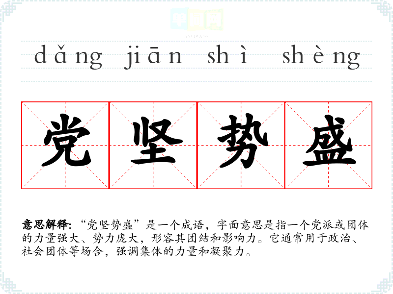 “党坚势盛”是一个成语,字面意思是指一个党派或团体的力量强大、势力庞大,形容其团结和影响力。它通常用于政治、社会团体等场合,强调集体的力量和凝聚力。
