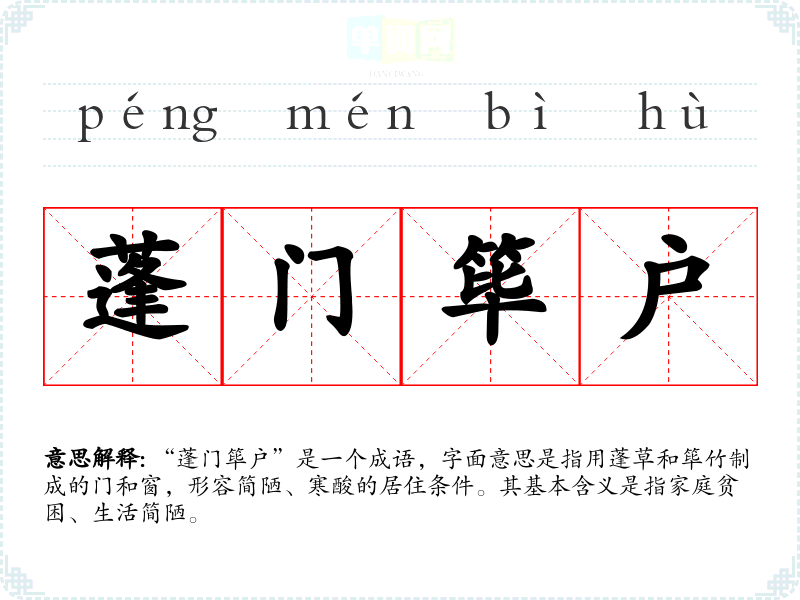 | 蓬门筚户 | 蓬门:用蓬草编成的门;筚户:用荆条竹子树枝编成的门。形容穷苦人家所住的简陋的房屋。 |