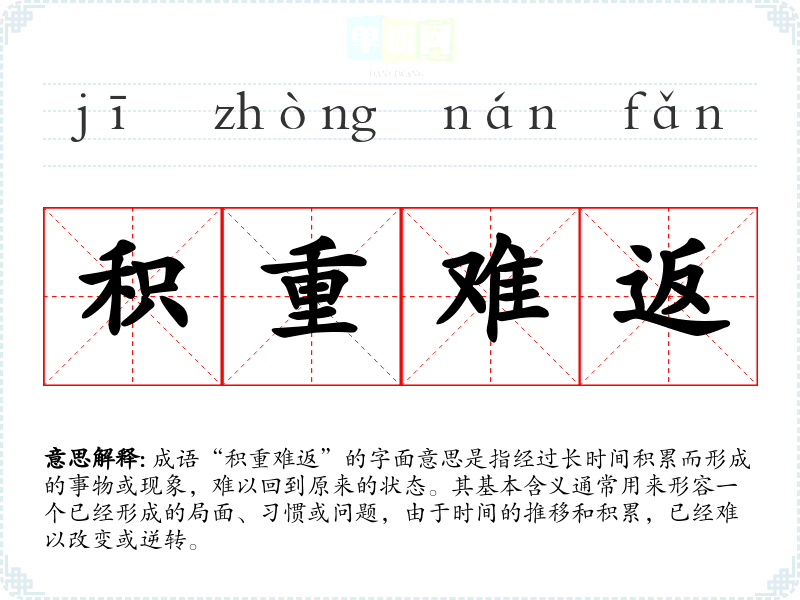 成语“积重难返”的字面意思是指经过长时间积累而形成的事物或现象,难以回到原来的状态。其基本含义通常用来形容一个已经形成的局面、*惯或问题,由于时间的推移和积累,已经难以改变或逆转。