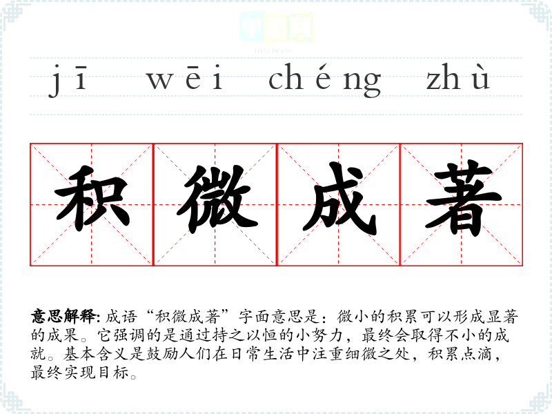 成语“积微成著”字面意思是:微小的积累可以形成显著的成果。它强调的是通过持之以恒的小努力,最终会取得不小的成就。基本含义是鼓励人们在日常生活中注重细微之处,积累点滴,最终实现目标。