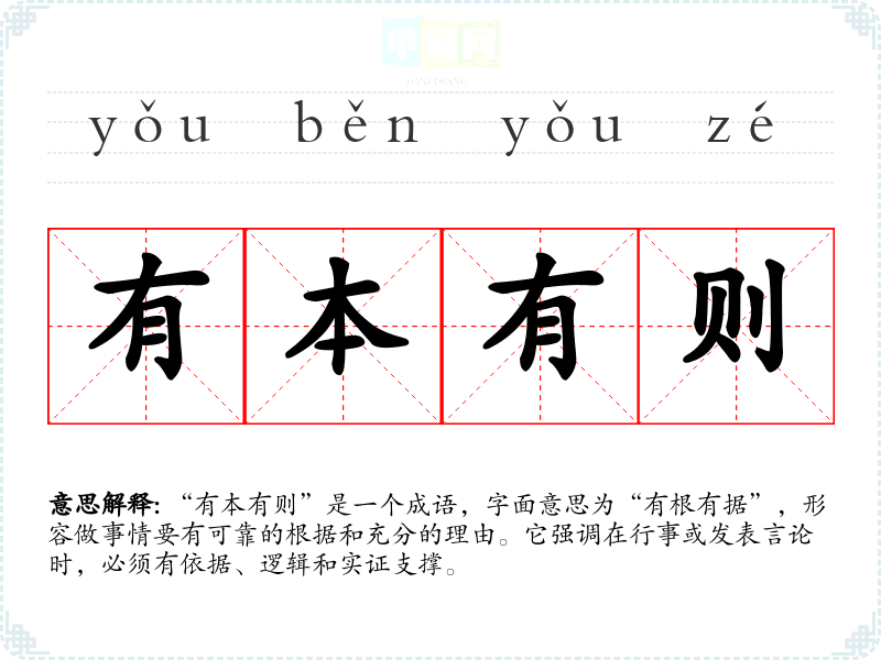 “有本有则”是一个成语,字面意思为“有根有据”,形容做事情要有可靠的根据和充分的理由。它强调在行事或发表言论时,必须有依据、逻辑和实证支撑。