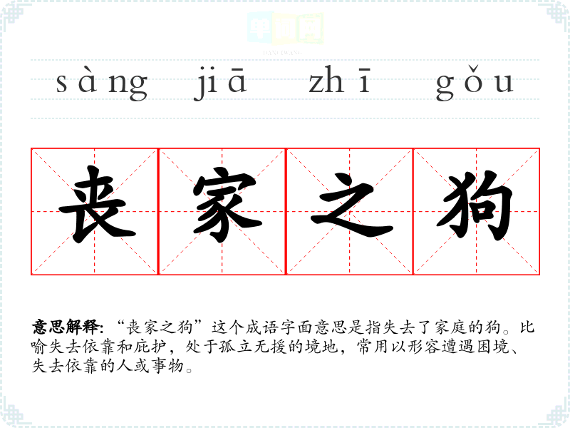 “丧家之狗”这个成语字面意思是指失去了家庭的狗。比喻失去依靠和庇护,处于孤立无援的境地,常用以形容遭遇困境、失去依靠的人或事物。
