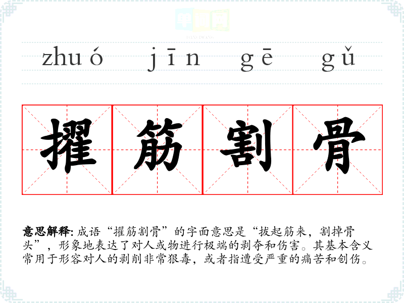 成语“擢筋割骨”的字面意思是“拔起筋来,割掉骨头”,形象地表达了对人或物进行极端的剥夺和伤害。其基本含义常用于形容对人的剥削非常狠毒,或者指遭受严重的痛苦和创伤。
