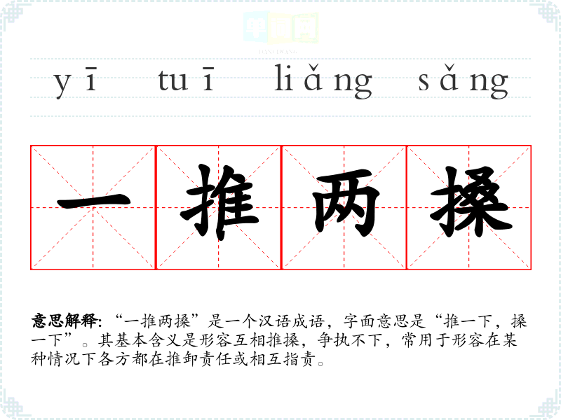 “一推两搡”是一个汉语成语,字面意思是“推一下,搡一下”。其基本含义是形容互相推搡,争执不下,常用于形容在某种情况下各方都在推卸责任或相互指责。