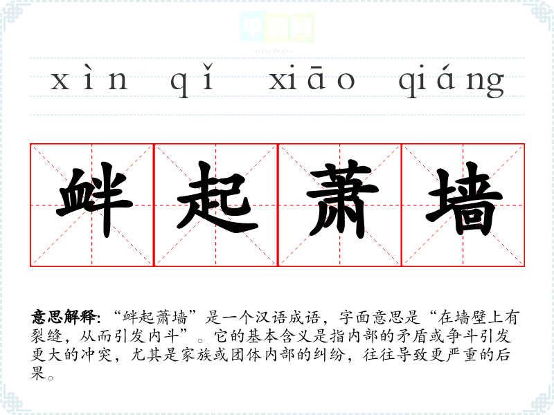 “衅起萧墙”是一个汉语成语,字面意思是“在墙壁上有裂缝,从而引发内斗”。它的基本含义是指内部的矛盾或争斗引发更大的冲突,尤其是家族或团体内部的纠纷,往往导致更严重的后果。