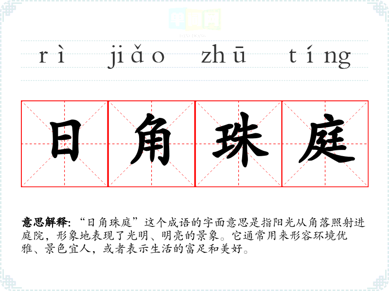 “日角珠庭”这个成语的字面意思是指阳光从角落照射进庭院,形象地表现了光明、明亮的景象。它通常用来形容环境优雅、景色宜人,或者表示生活的富足和美好。