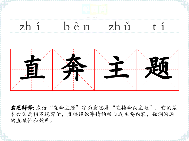 成语“直奔主题”字面意思是“直接奔向主题”。它的基本含义是指不绕弯子,直接谈论事情的核心或主要内容,强调沟通的直接性和效率。