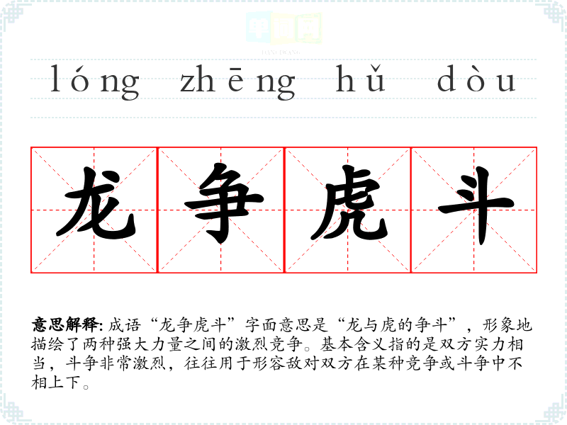 成语“龙争虎斗”字面意思是“龙与虎的争斗”,形象地描绘了两种强大力量之间的激烈竞争。基本含义指的是双方实力相当,斗争非常激烈,往往用于形容敌对双方在某种竞争或斗争中不相上下。