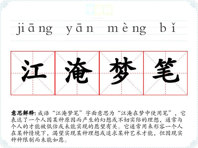 成语“江淹梦笔”字面意思为“江淹在梦中使用笔”,它表达了一个人因某种原因而产生的幻想或不切实际的理想,通常与个人的才能被低估或未能实现的愿望有关。它通常用来形容一个人在某种情境下,渴望实现某种理想或追求某种艺术才能,但因现实种种限制而未能如愿。