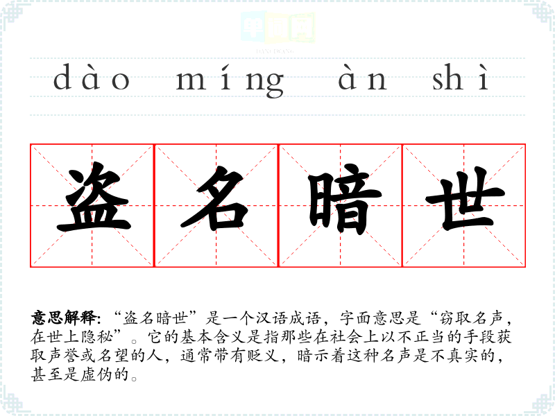 “盗名暗世”是一个汉语成语,字面意思是“窃取名声,在世上隐秘”。它的基本含义是指那些在社会上以不正当的手段获取声誉或名望的人,通常带有贬义,暗示着这种名声是不真实的,甚至是虚伪的。