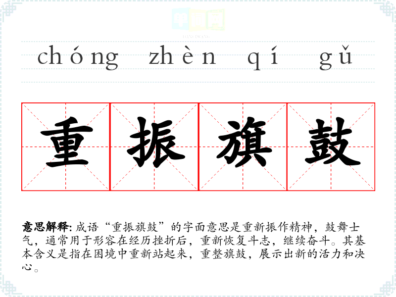成语“重振旗鼓”的字面意思是重新振作精神,鼓舞士气,通常用于形容在经历挫折后,重新恢复斗志,继续奋斗。其基本含义是指在困境中重新站起来,重整旗鼓,展示出新的活力和决心。