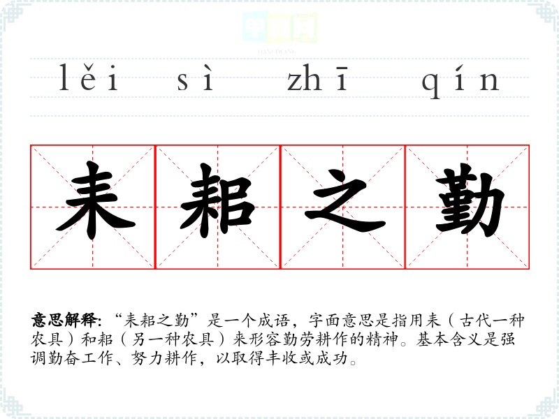 “耒耜之勤”是一个成语,字面意思是指用耒(古代一种农具)和耜(另一种农具)来形容勤劳耕作的精神。基本含义是强调勤奋工作、努力耕作,以取得丰收或成功。