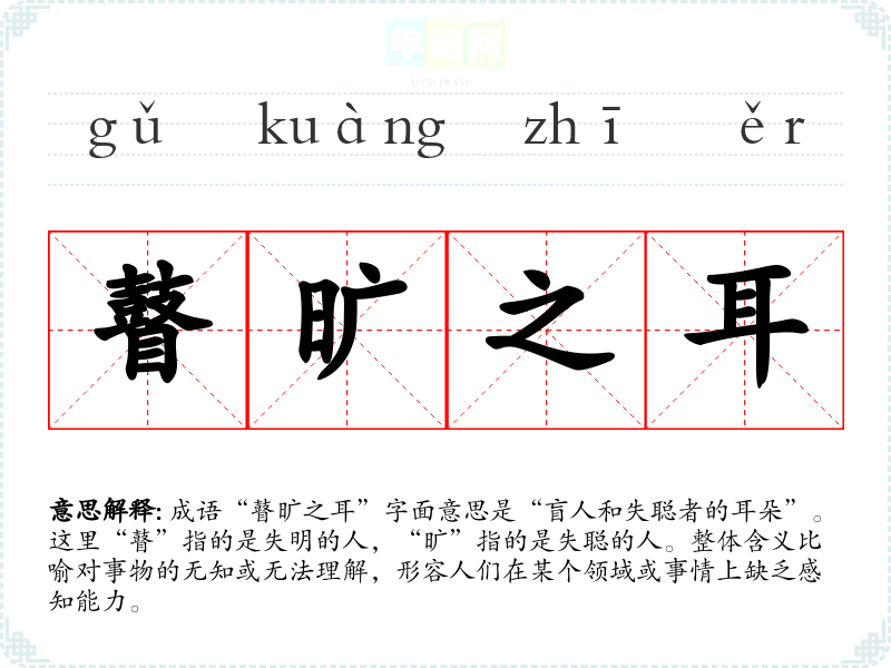 成语“瞽旷之耳”字面意思是“盲人和失聪者的耳朵”。这里“瞽”指的是失明的人,“旷”指的是失聪的人。整体含义比喻对事物的无知或无法理解,形容人们在某个领域或事情上缺乏感知能力。