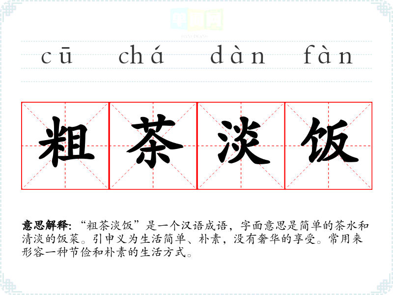 “粗茶淡饭”是一个汉语成语,字面意思是简单的茶水和清淡的饭菜。引申义为生活简单、朴素,没有奢华的享受。常用来形容一种节俭和朴素的生活方式。