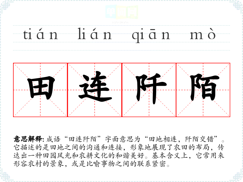 成语“田连阡陌”字面意思为“田地相连,阡陌交错”。它描述的是田地之间的沟通和连接,形象地展现了农田的布局,传达出一种田园风光和农耕文化的和谐美好。基本含义上,它常用来形容农村的景象,或是比喻事物之间的联系紧密。