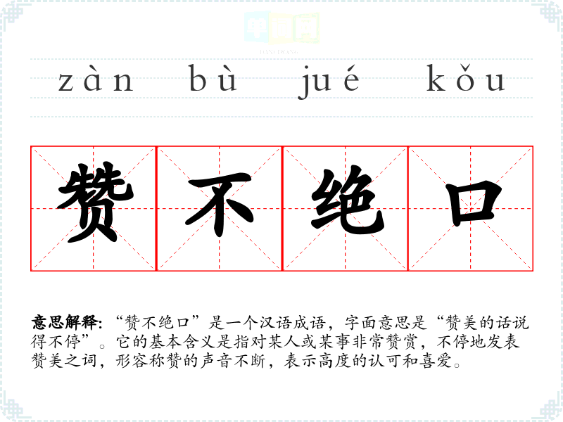 “赞不绝口”是一个汉语成语,字面意思是“赞美的话说得不停”。它的基本含义是指对某人或某事非常赞赏,不停地发表赞美之词,形容称赞的声音不断,表示高度的认可和喜爱。