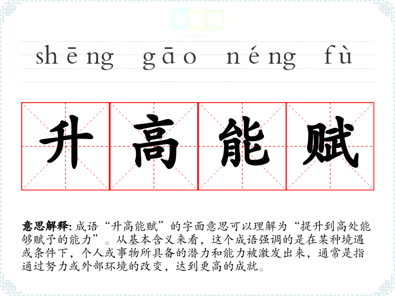 成语“升高能赋”的字面意思可以理解为“提升到高处能够赋予的能力”。从基本含义来看,这个成语强调的是在某种境遇或条件下,个人或事物所具备的潜力和能力被激发出来,通常是指通过努力或外部环境的改变,达到更高的成就。