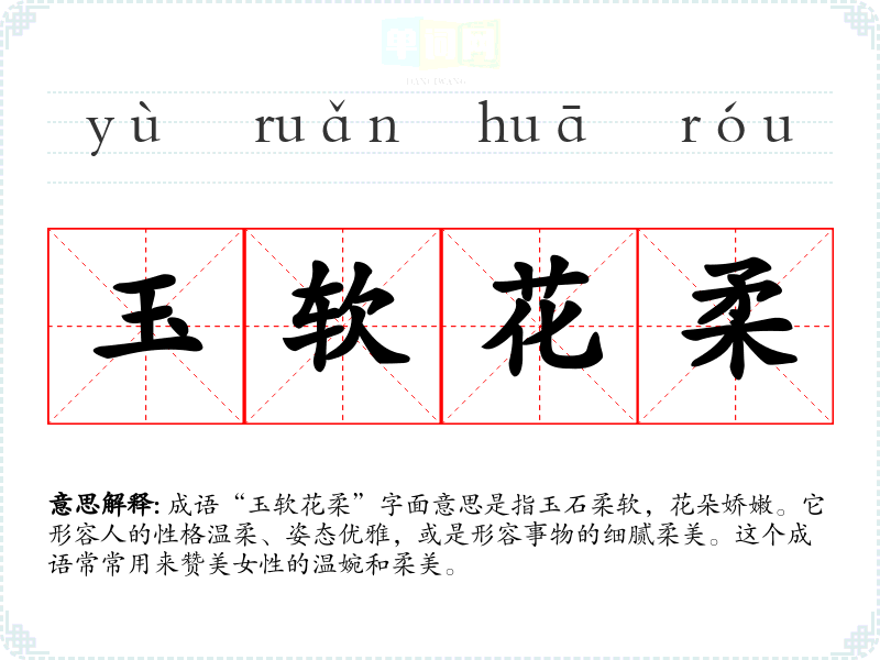 成语“玉软花柔”字面意思是指玉石柔软,花朵娇嫩。它形容人的性格温柔、姿态优雅,或是形容事物的细腻柔美。这个成语常常用来赞美女性的温婉和柔美。