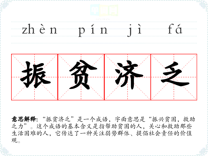 “振贫济乏”是一个成语,字面意思是“振兴贫困,救助乏力”。这个成语的基本含义是指帮助贫困的人,关心和救助那些生活困难的人,它传达了一种关注弱势群体、提倡社会责任的价值观。