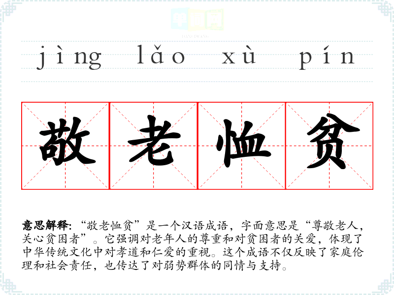 “敬老恤贫”是一个汉语成语,字面意思是“尊敬老人,关心贫困者”。它强调对老年人的尊重和对贫困者的关爱,体现了中华传统文化中对孝道和仁爱的重视。这个成语不仅反映了家庭伦理和社会责任,也传达了对弱势群体的同情与支持。