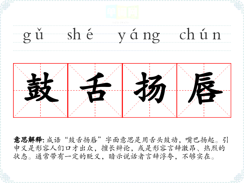 成语“鼓舌扬唇”字面意思是用舌头鼓动,嘴巴扬起。引申义是形容人们口才出众,擅长辩论,或是形容言辞激昂、热烈的状态。通常带有一定的贬义,暗示说话者言辞浮夸,不够实在。