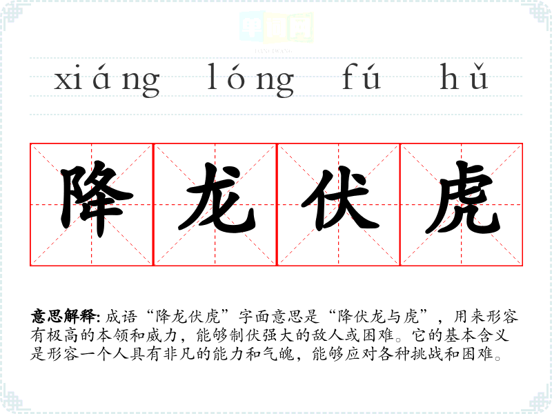 成语“降龙伏虎”字面意思是“降伏龙与虎”,用来形容有极高的本领和威力,能够制伏强大的敌人或困难。它的基本含义是形容一个人具有非凡的能力和气魄,能够应对各种挑战和困难。