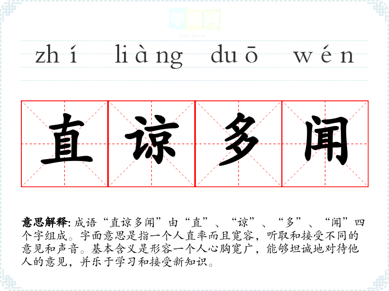 “直谅多闻”给人一种积极向上的感觉,体现了理性与包容。它让我联想到与朋友或同事交流时的愉快体验,尤其是在讨论中能够互相倾听和学*的情景。