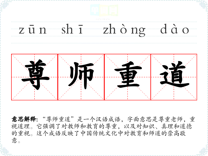 “尊师重道”是一个汉语成语,字面意思是尊重老师,重视道理。它强调了对教师和教育的尊重,以及对知识、真理和道德的重视。这个成语反映了**传统文化中对教育和师道的崇高敬意。