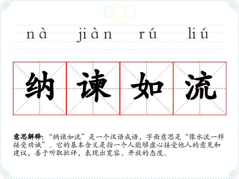 “纳谏如流”是一个汉语成语,字面意思是“像水流一样接受劝诫”。它的基本含义是指一个人能够虚心接受他人的意见和建议,善于听取批评,表现出宽容、开放的态度。
