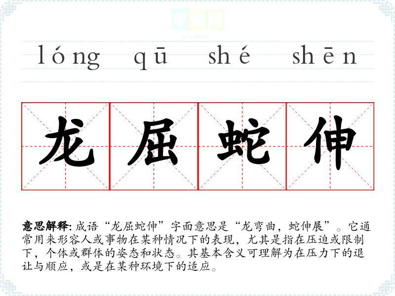 成语“龙屈蛇伸”字面意思是“龙弯曲,蛇伸展”。它通常用来形容人或事物在某种情况下的表现,尤其是指在压迫或限制下,个体或群体的姿态和状态。其基本含义可理解为在压力下的退让与顺应,或是在某种环境下的适应。