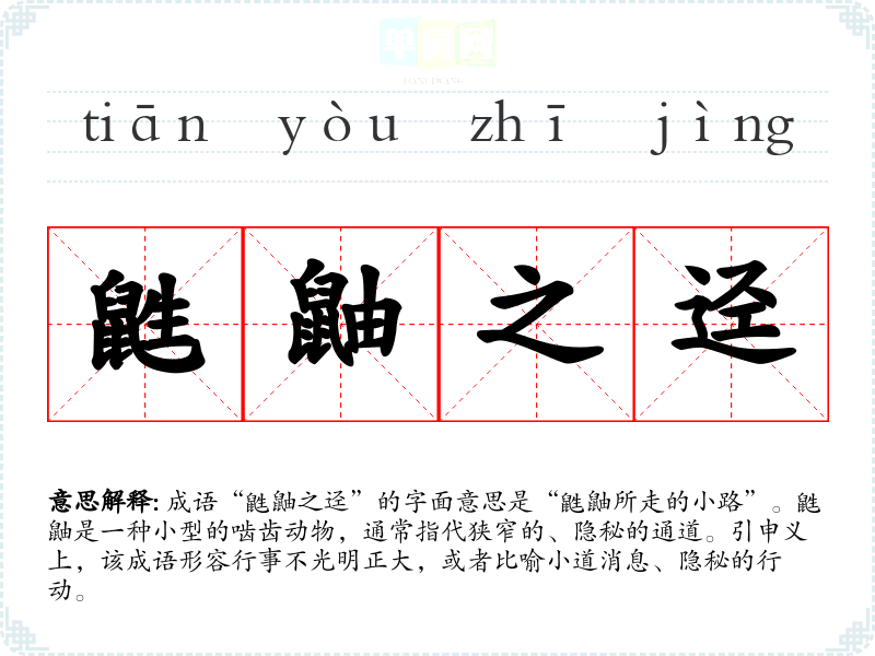 成语“鼪鼬之迳”的字面意思是“鼪鼬所走的小路”。鼪鼬是一种小型的啮齿动物,通常指代狭窄的、隐秘的通道。引申义上,该成语形容行事不光明正大,或者比喻小道消息、隐秘的行动。