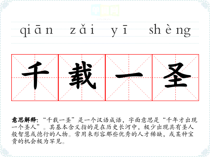 “千载一圣”是一个汉语成语,字面意思是“千年才出现一个圣人”。其基本含义指的是在历史长河中,极少出现具有圣人般智慧或德行的人物。常用来形容那些优秀的人才稀缺,或某种宝贵的机会极为罕见。