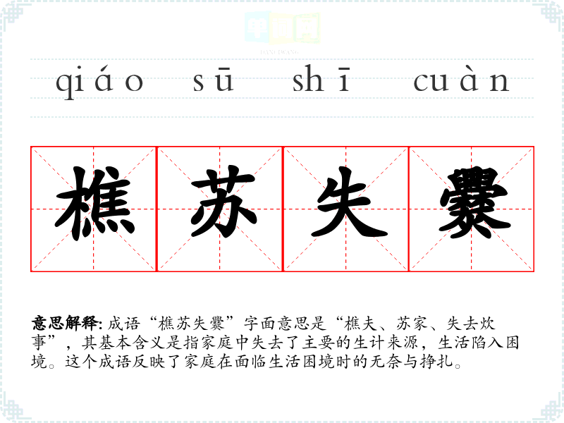 成语“樵苏失爨”字面意思是“樵夫、苏家、失去炊事”,其基本含义是指家庭中失去了主要的生计来源,生活陷入困境。这个成语反映了家庭在面临生活困境时的无奈与挣扎。