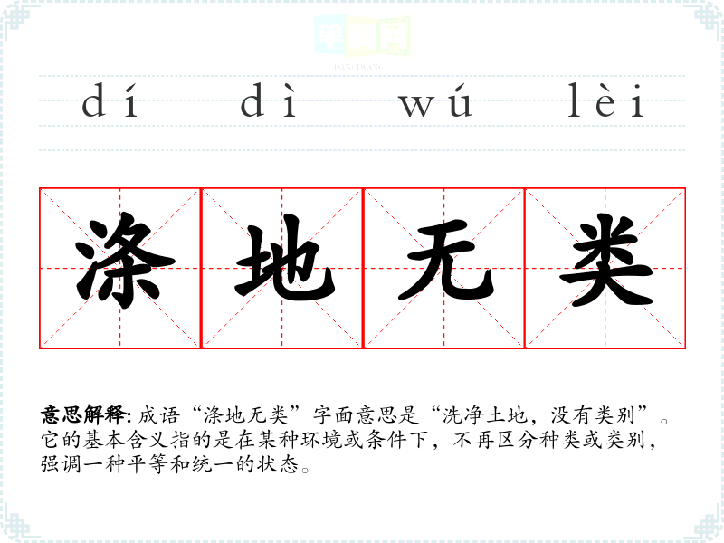 成语“涤地无类”字面意思是“洗净土地,没有类别”。它的基本含义指的是在某种环境或条件下,不再区分种类或类别,强调一种平等和统一的状态。
