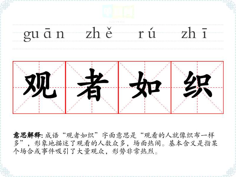 成语“观者如织”字面意思是“观看的人就像织布一样多”,形象地描述了观看的人数众多,场面热闹。基本含义是指某个场合或**吸引了大量观众,形势非常热烈。
