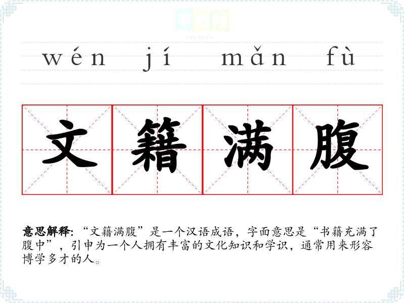 “文籍满腹”是一个汉语成语,字面意思是“书籍充满了腹中”,引申为一个人拥有丰富的文化知识和学识,通常用来形容博学多才的人。
