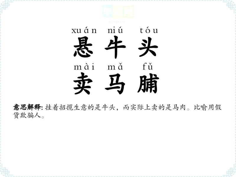 | 羊头马脯 | 挂着招揽生意的是羊头,而实际上卖的是马肉。比喻用假货欺骗人。 |