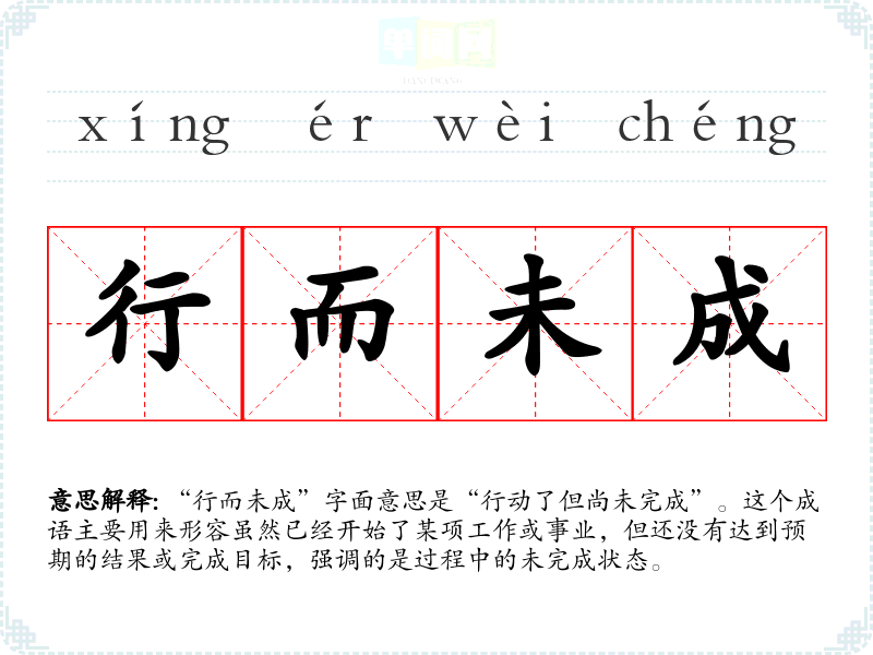 “行而未成”字面意思是“行动了但尚未完成”。这个成语主要用来形容虽然已经开始了某项工作或事业,但还没有达到预期的结果或完成目标,强调的是过程中的未完成状态。