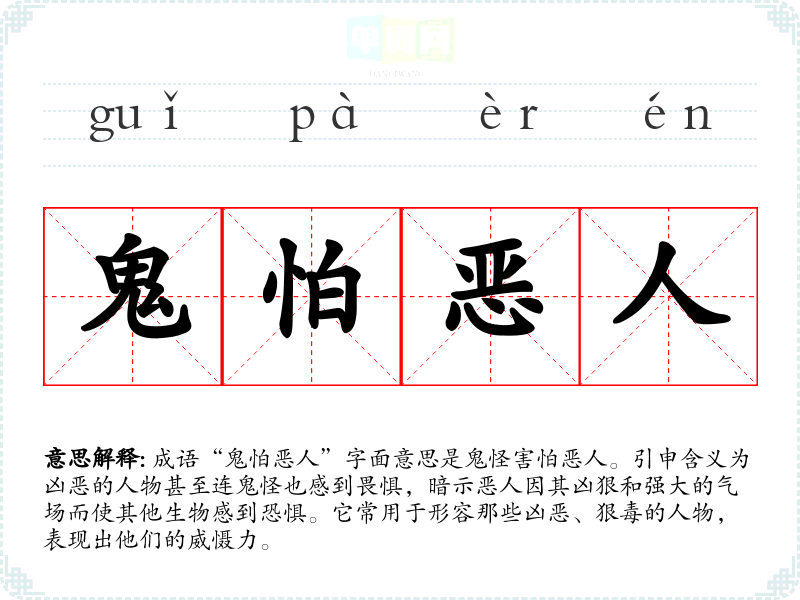 成语“鬼怕恶人”字面意思是鬼怪害怕恶人。引申含义为凶恶的人物甚至连鬼怪也感到畏惧,暗示恶人因其凶狠和强大的气场而使其他生物感到恐惧。它常用于形容那些凶恶、狠毒的人物,表现出他们的威慑力。